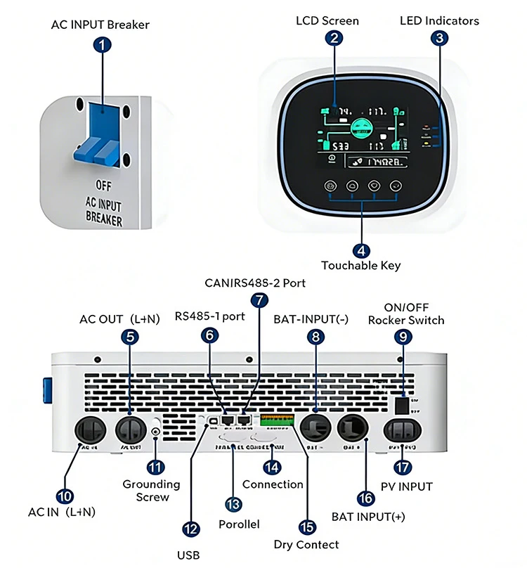 عاكس خارج الشبكة ثنائي الطور بجهدين 120 فولت و240 فولت، سعات: 5 كيلوواط، 8 كيلوواط، 10 كيلوواط، 10 كيلوفولت-أمبير، 12 كيلوواط، 12 كيلوواط، بجهد دخل 48 فولت، عاكس شمسي متكامل للاستخدام المنزلي