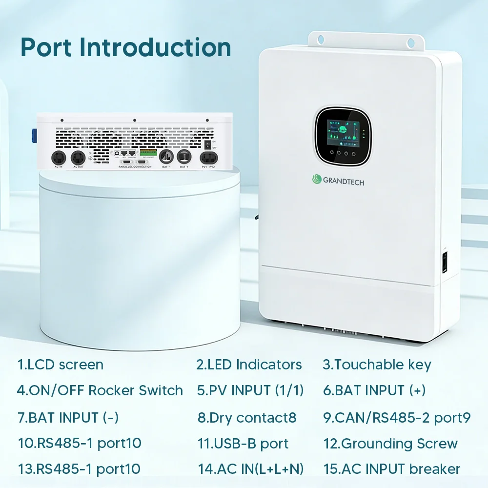 Es liefert eine Nennleistung von 10.000 W (Spitzenleistung von 20.000 W) mit reinem Sinus-Wechselstromausgang bei 120 V einphasig / 240 V zweiphasig. Das System unterstützt 48-V-Li-Ionen- und Blei-Säure-Batterien mit einer Lade-Stromstärke von bis zu 200 A. Mit zwei MPPT-Eingängen (5.500 W + 5.500 W, Wirkungsgrad von 99,9 %) und maximaler PV-Eingangsspannung von 500 V gewährleistet es eine hohe Solarenergieausbeute.