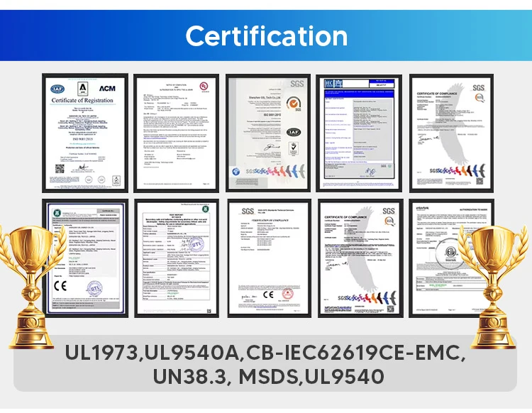 UL1973, UL9540A, CB-IEC62619, CE-EMC, UN38.3, MSDS, UL9540 |