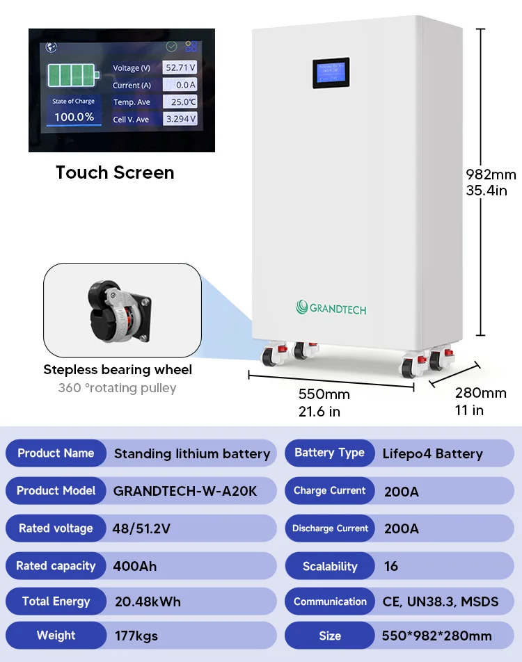 batteria Lifepo4 da pavimento per uso domestico da 48 V / 400 Ah, 51,2 V / 20 kWh o 16 kWh, batterie agli ioni di litio per sistema di accumulo di energia solare montabile a parete