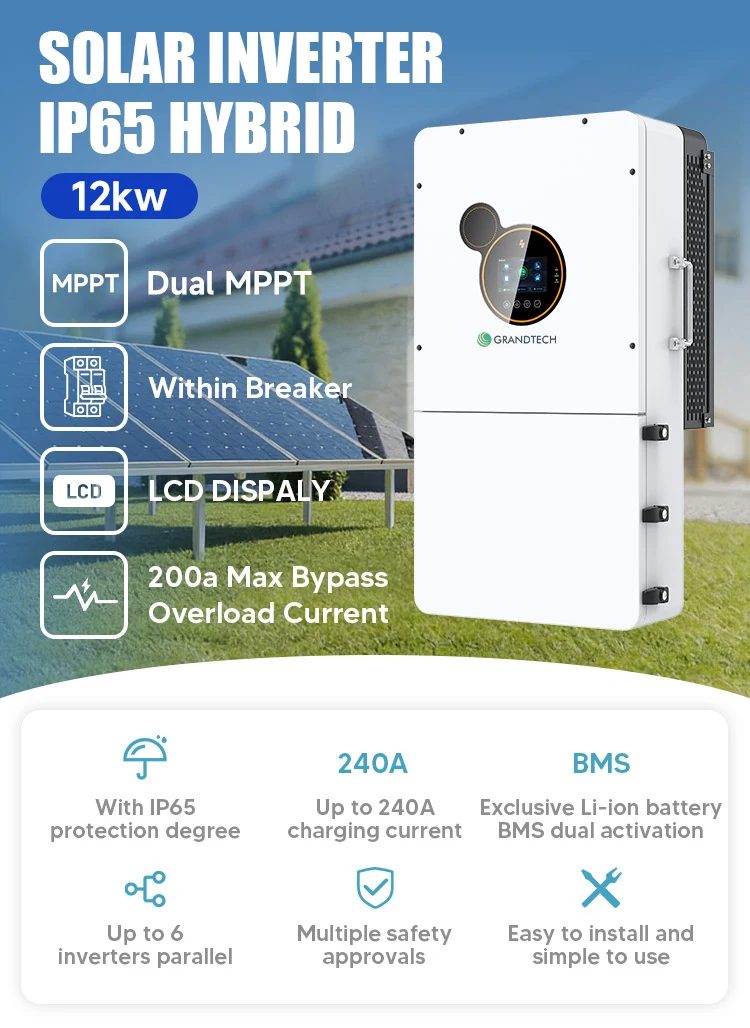SEI 12 kW / 8 kW hibridinis saulės inversinis keitiklis, dvigubas MPPT, 240 A įkroviklis, 200 A apėjimo grandinė, grynosios sinusoidos formos išėjimo įtampa, apsaugos laipsnis IP65, skirtas gyvenamųjų pastatų ir izoliuotų nuo tinklo saulės energijos sistemų naudojimui