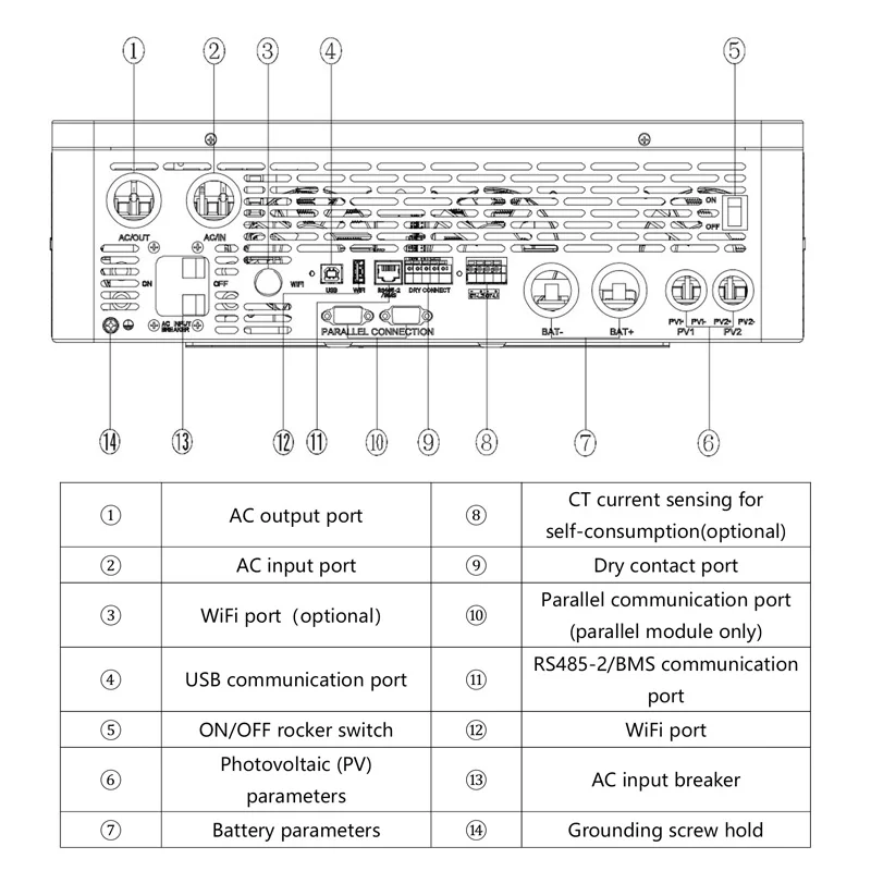US LAGER 48 V 12 kW Hybrid solinverter Enkelt-/tre-fase 120/240 V Split-fase IP20 Vannskjermet WiFi Vekselstrøms nominell effekt