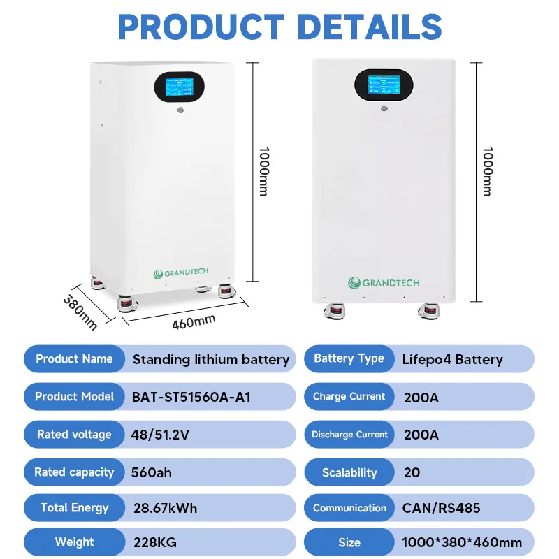 Us Stock Grandtech 51.2V 560ah LiFePO4 Battery 28KWh 280Ah 560Ah 48V 30KWh ESS Energy Storage System 48V
