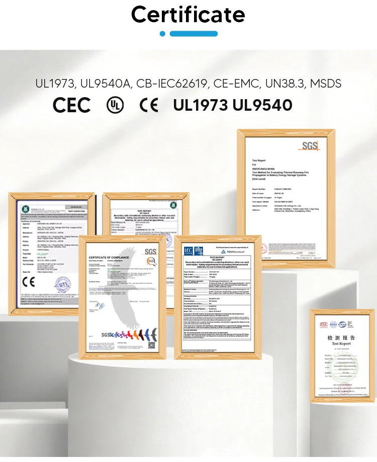 UL1973,UL9540,UL9540A,ETL,ISO va boshqa sertifikatlarga ega bo'libmiz;