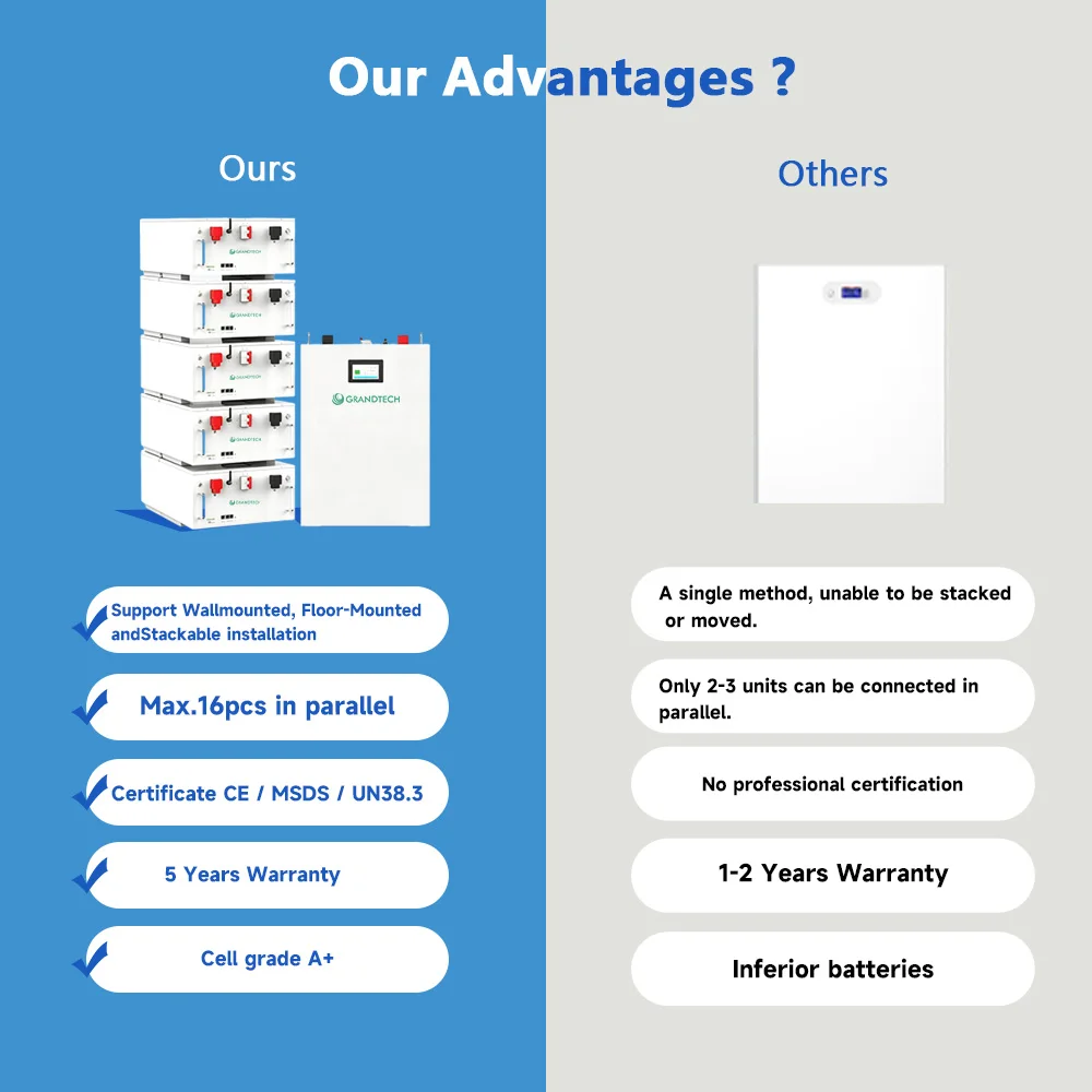 SICHUAN GRANDTECH NEW ENERGY TECHNOLOGY CO. LTD. — quyosh energiyasini saqlash sohasida professional ta'minotchi hisoblanadi. Kompaniya yuqori sifatli quyosh invertorlari va energiya saqlash batareyalarini ishlab chiqarish hamda ularga bozorlik qilish bilan shug'ullanadi; IEC62619, UL1741(SA&SB), UL1973, UL9540, UL9540A, ETL, ISO kabi sertifikatlarga ega. AQSH va Yevropa mamlakatlari bo'ylab mijozlarga tez yetkazib berish imkoniyatiga ega bo'lishimizning sababi — Kaliforniya va Polshada omborlarimiz mavjud. Biz mijozlarga yuqori sifatli mahsulotlar, yaxshi xizmat ko'rsatish, vaqtida yetkazib berish va raqobatbardosh narxlarni ta'minlashga intilamiz va hamkorlik qilishdan mamnun bo'lamiz.